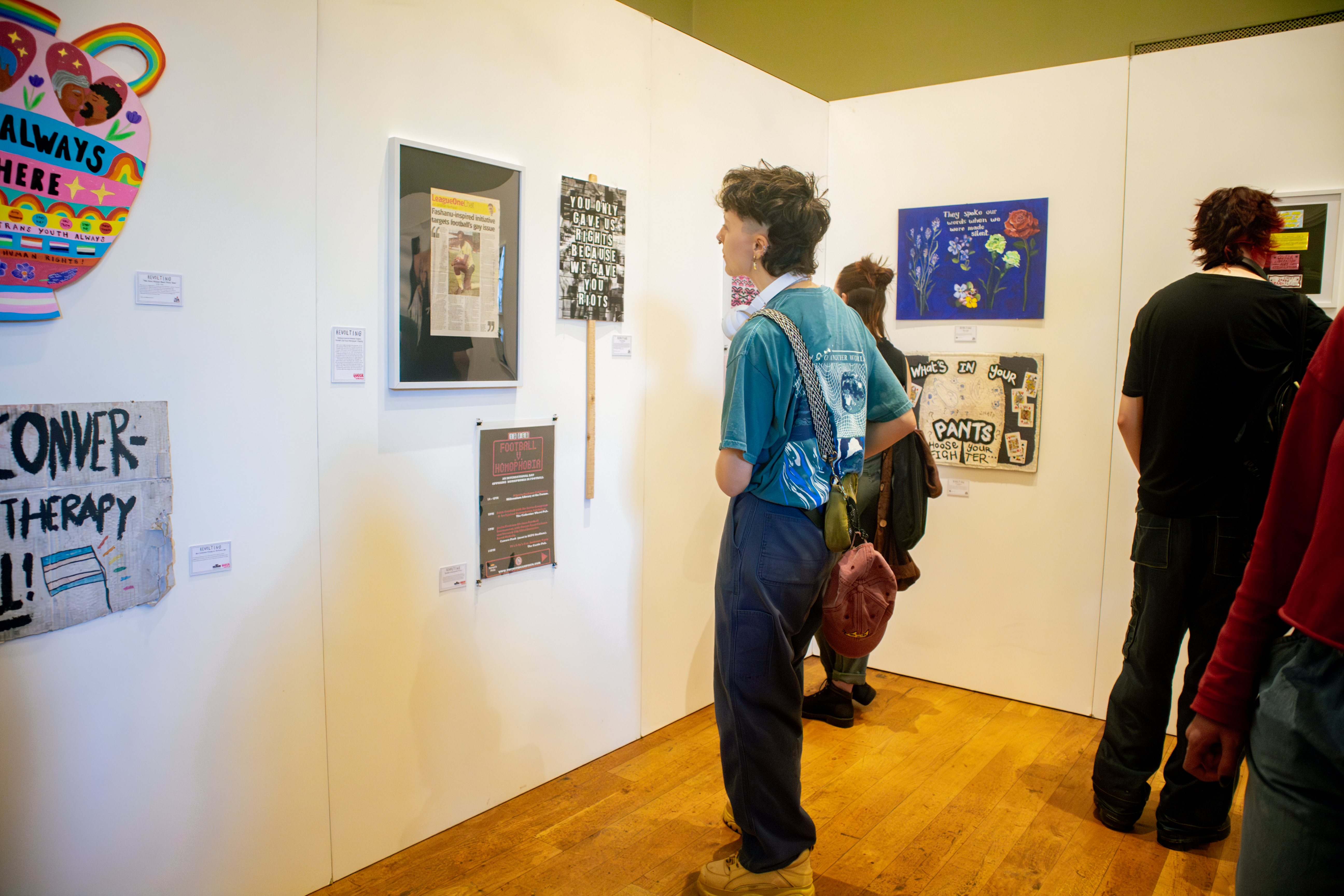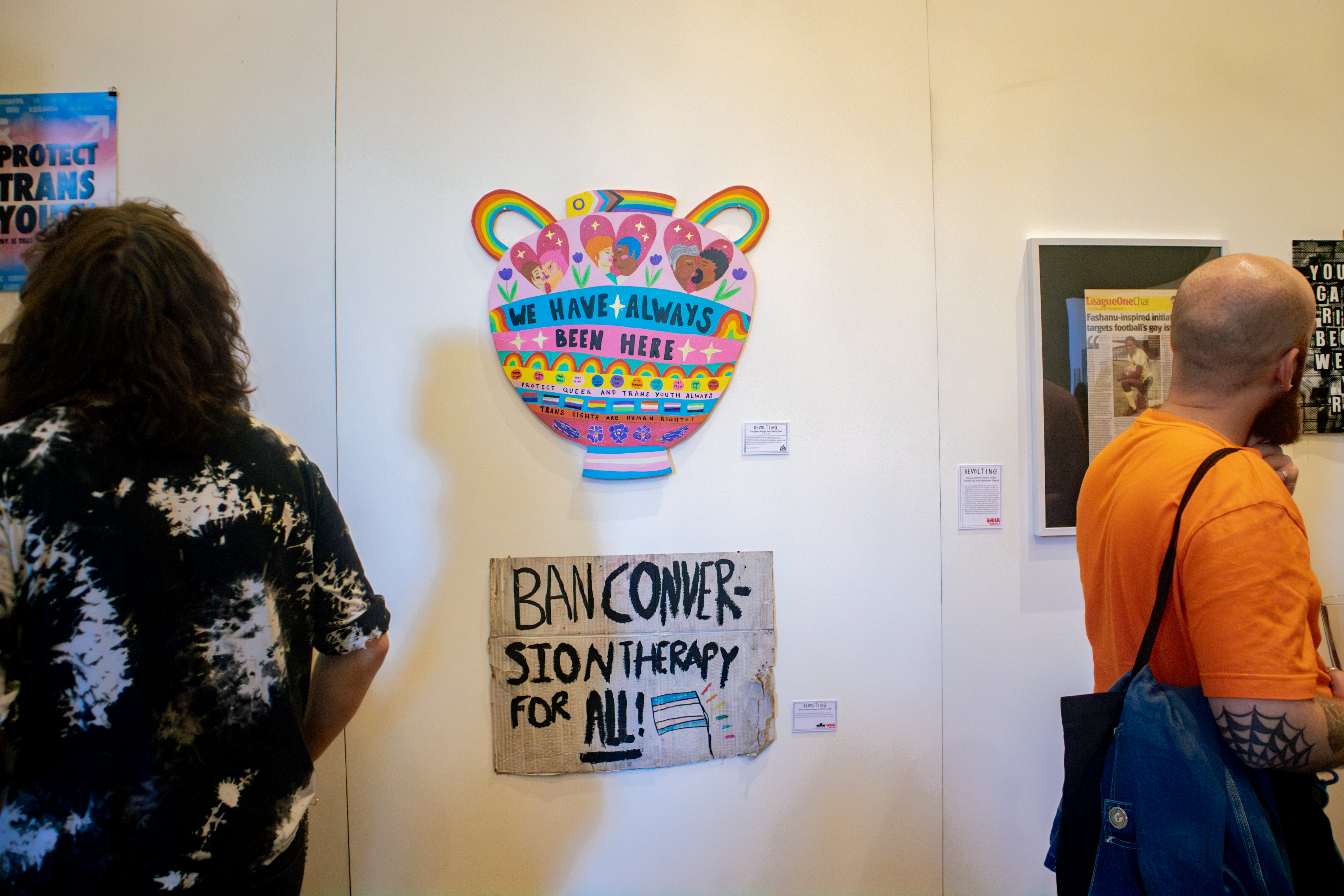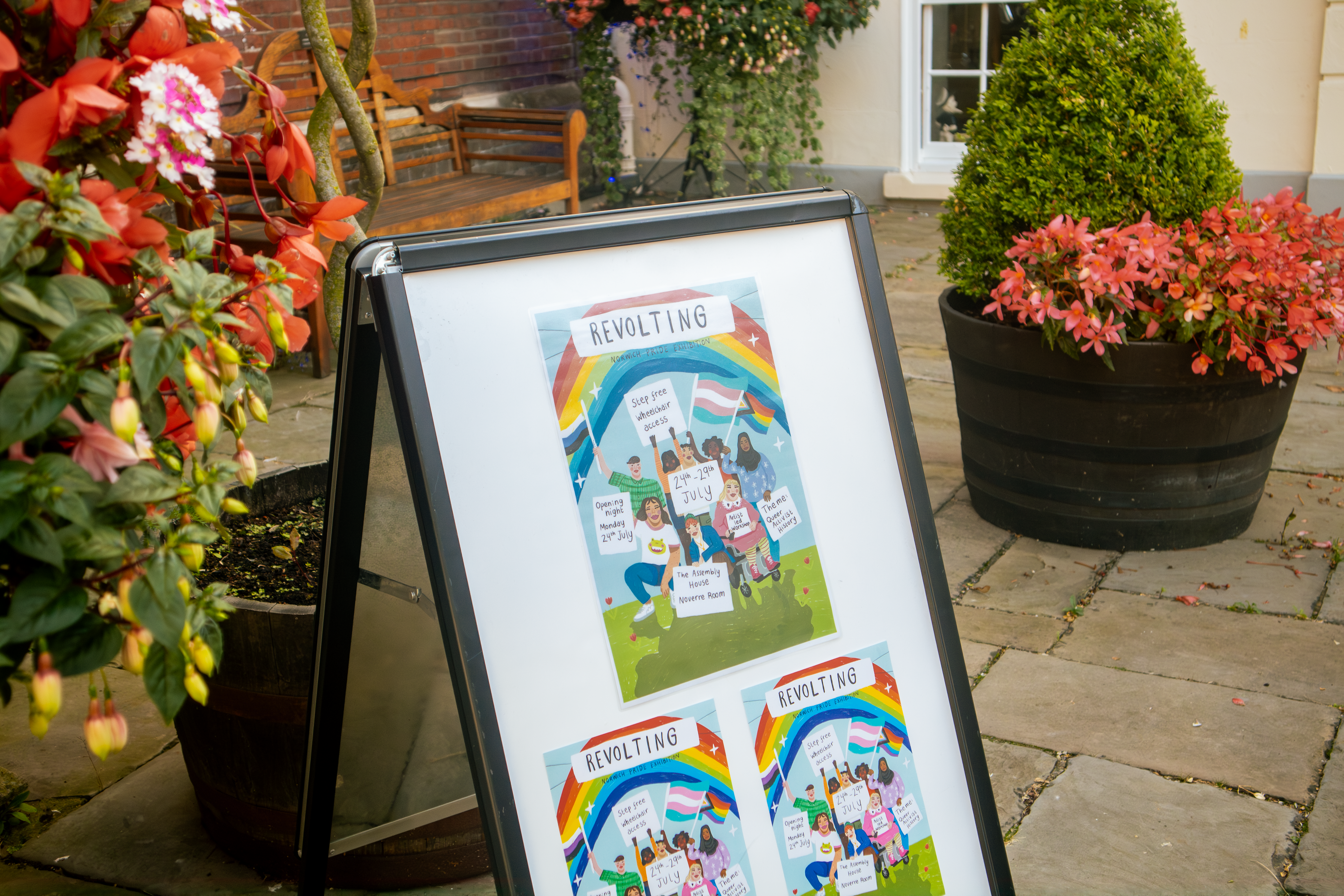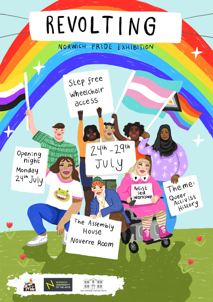 For Norwich Pride’s annual exhibition, we chose the theme queer activism history with the title ‘Revolting’. Artists have responded to this theme by looking to their queer history, community, and experiences relating to demonstrations, protests, and politics. Inspired by historic events such as Section 28, the AIDS crisis, and the marriage equality act. It also looks at recent events such as conversion therapy, ‘the trans debate’, and the increase in violent hate crimes.